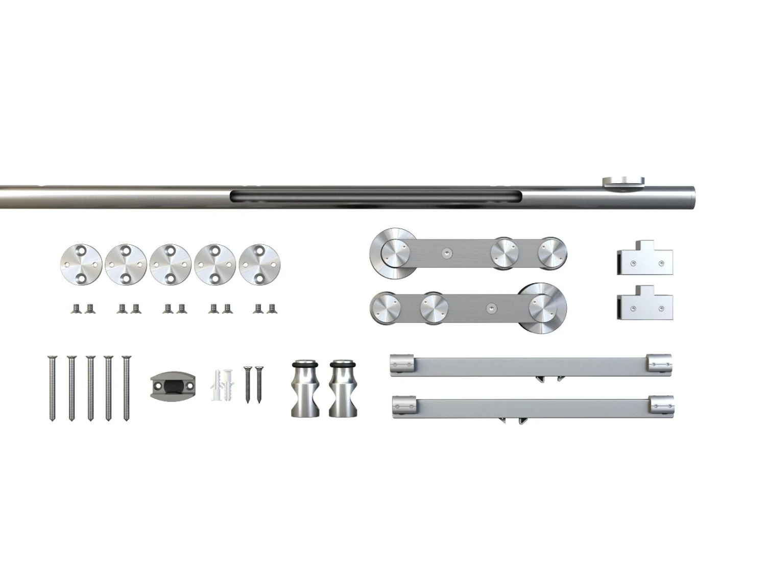 A stylish high quality system for frameless glass doors. Made from 304 stainless steel this system incorporates a tubular track with recessed soft close unit each end and high quality hanger units with countersunk glass fixings. Kit includes all required fixings and both the soft open and soft close as standard.